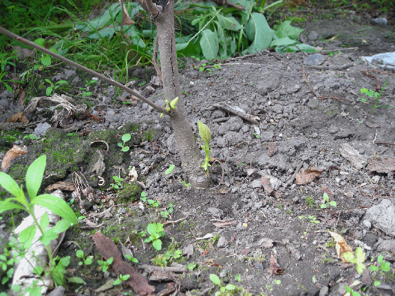 春に葉が落ち枯れた物と思い路地に植えて放置していたものが新芽を出して伸びてきました。
